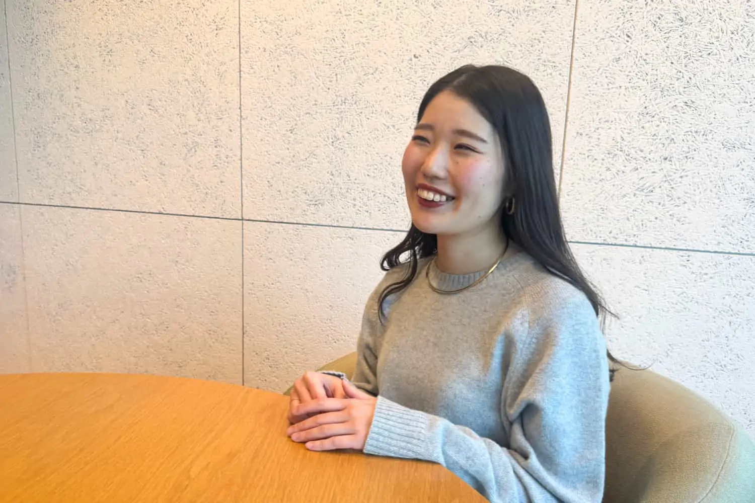 - 接客で大事にしていることは、まず挨拶です。入店されたときの挨拶は当たり前のことではあるのですが、しっかり目を合わせて、きちんと伝わる挨拶をすることを意識しています。もう一つ大切にしているのが、観察です。お客さまだけでなく周りのスタッフの動きも含めてよく見るようにしていて、今どんな状況なのか、何をするのが一番良いのかを、広い視野で瞬時に判断して動くように心がけています。 私の接客スタイルは、専門用語をたくさん使うのではなくて、あえてあまり難しい言葉は使いません。家族や友達と話すような、自然なテンションで接したいという気持ちがあります。というのも、私自身が買い物をしている時に、急に詳しい説明をされるのがあまり得意ではないんです。なので、ファーストアプローチは軽く声をかけ、そこから少し様子を見るようにしています。お客さまが求めているか分からない情報を、こちらの都合で出すことはしません。最初はあくまで、不快に思われないこと、嫌だと感じられないことを優先して、目線や動きも含めて声のかけ方を考えています。 「何かお探しですか?」といった質問も、必要がなければあえて言わないようにしています。その代わりにしっかりお客さまを観察して、黒の色の洋服を見ているなとか、スカートをさわっているなと分かったら、それに関係することでお声がけをするようにしています。「スカートをいろいろ見ていらっしゃいますか?」とお客さまの動きに合った言い方に変えて、具体的な言葉での声がけにしています。 声のトーンも、接客用のトーンなどに変えず、普段自分が話しているくらいの落ち着いた音量で話すようにしています。基本的には、お客さまのテンションよりも少し落ち着いたくらいのトーンで、ゆっくり話すことが多いです。こちらが一方的に話すのではなく、お客さまから自然と話してもらえるような会話になるよう心がけていますね。