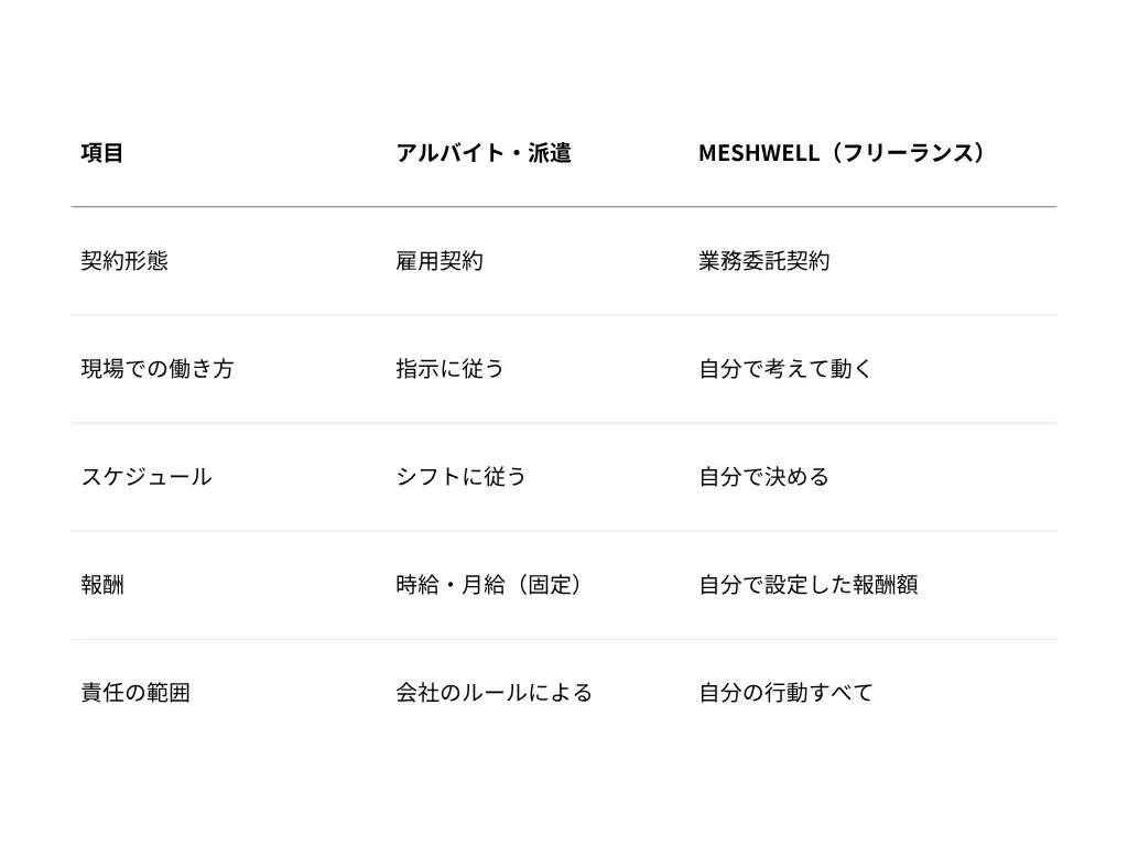 窪田代表、いよいよ4月!新生活を迎えられた方も多くいらっしゃいますよね。今年度から新たにMESHWELLを利用し始めたという方もいると思うのですが、改めてこのサービスでの働き方と、アルバイトや派遣といった働き方の違いについて教えてほしいです!